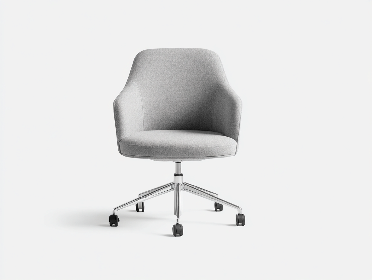 La seduta e lo schienale sono rivestiti in tessuto resistente di colore grigio chiaro, piacevole al tatto e facile da abbinare a diversi stili di arredo. L'imbottitura interna assicura un sostegno adeguato. La base è realizzata in metallo con finitura cromata e ruote integrate per uno spostamento fluido.